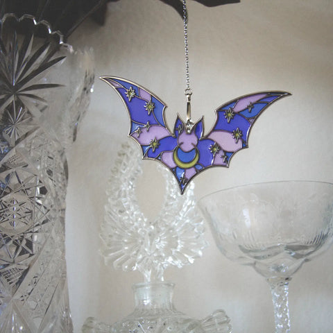 This small and beautiful suncatcher features a purple stained glass bat dotted with yellow stars and a moon. Hang it in your window with a small suction cup to use it as a festive suncatcher.