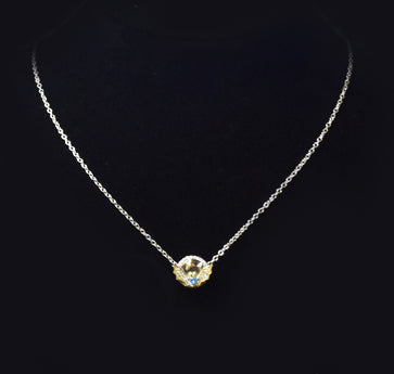 An intricate pendant with gold stars and a light blue heart against a silver background. Very small, only measures about 1/4" in diameter. The silver plated iron chain measures 18" inches, with a lobster clasp.